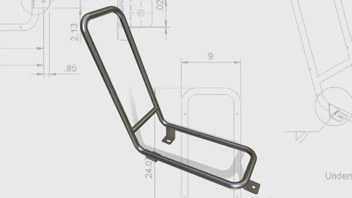 Jump seat frame for a vintage Ford Bronco. The part will be manufactured for Agaso Outdoor, a vintage restoration shop in Ventura California.